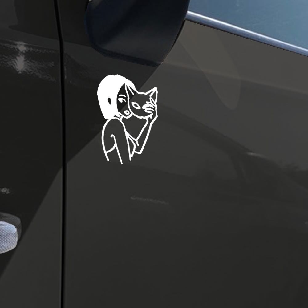 車 ステッカー 猫を被る 女 キャット 仮面 給油口 おもしろ かっこいい カー用品 シール おしゃれ 転写式 白 黒 st1332